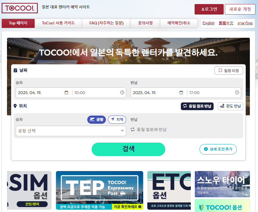 방일 여행자를 위한 「TOCOO!」 렌터카를 이용하면, 기차로는 갈 수 없는 지방의 마을이나 숨겨진 인기 명소들도 자유롭게 둘러볼 수 있습니다.